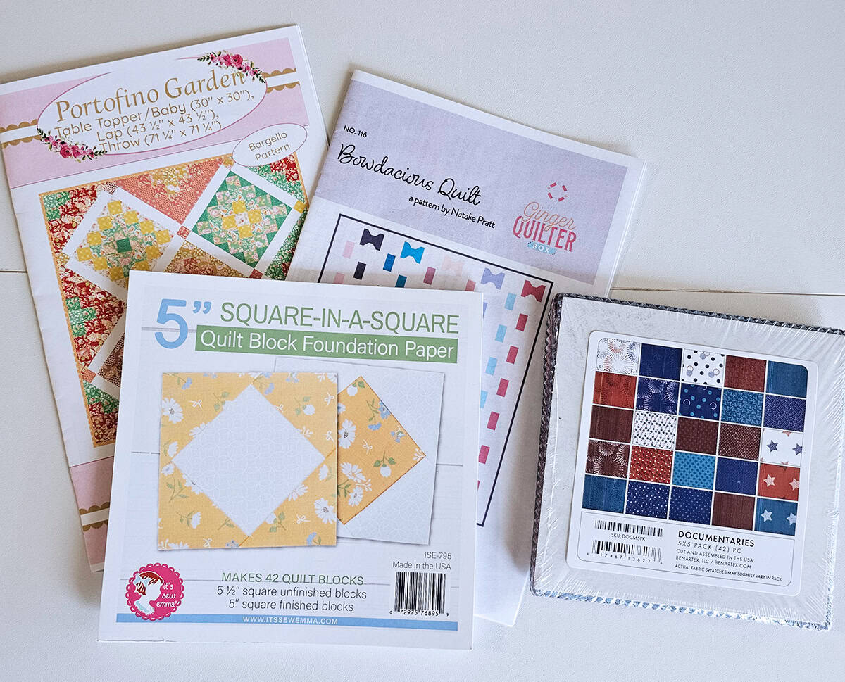 Be sure to enter the Linky Party this month for a chance to win this bundle 2 quilt patterns, 5″ Square in a Square Foundation papers and a charm pack called Documentaries. This will only be sent to a US mailing address sorry. If you are outside of the US and win – you will have your pick of 2 of my digital quilt patterns instead.