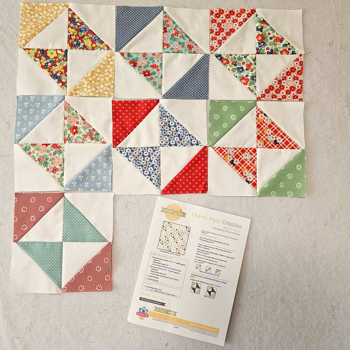 There was a link to a free pattern called Charm Pack Crispies in the Sew Sampler box and I decided to use the rest of the charm squares from the pack I had opened. These are fast and easy half square triangles made from 5-inch squares.