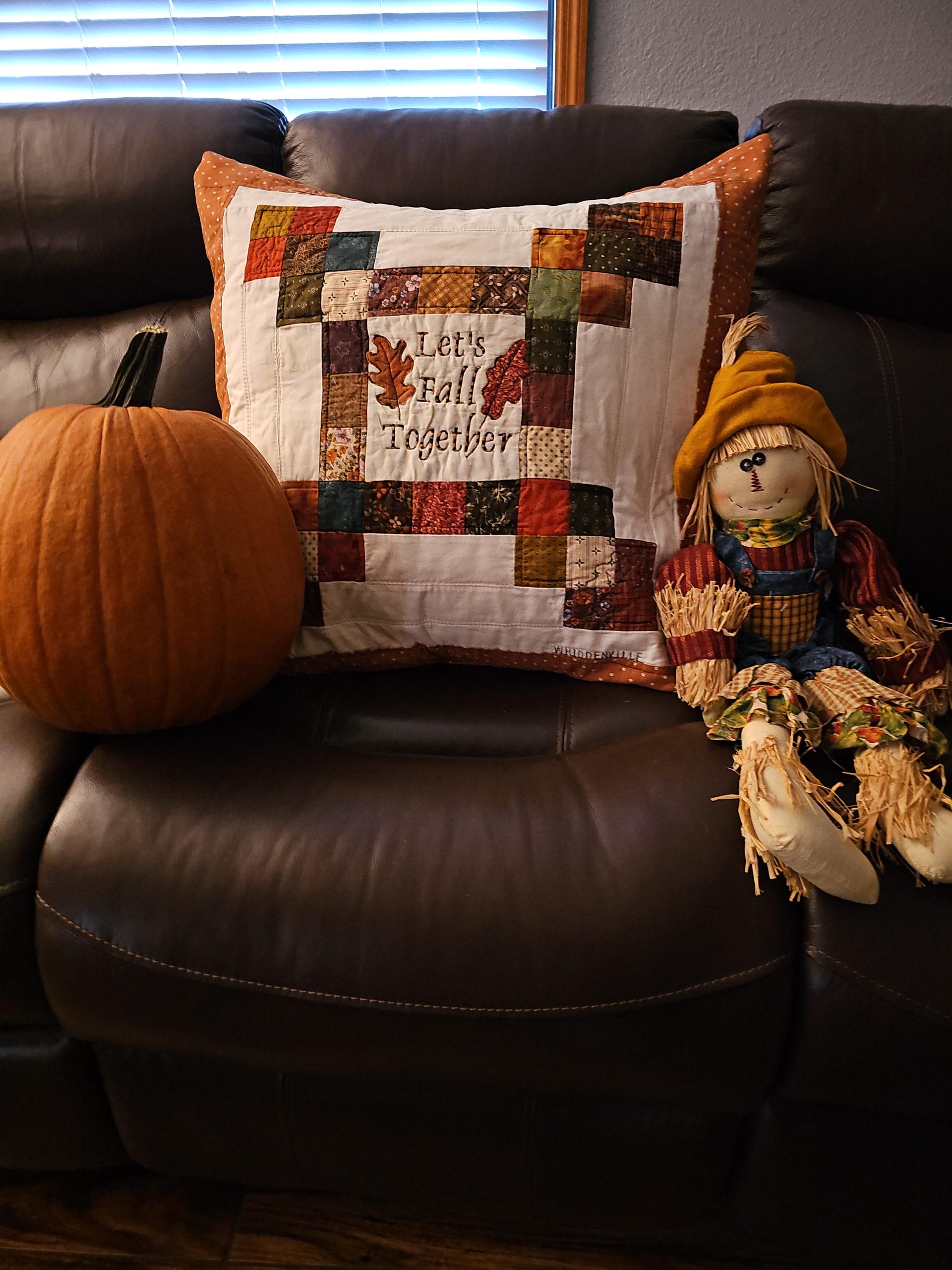 Mary made this beautiful pillow using my Easy Autumn Table Topper tutorial and added embroidery to the center. This is so neat, thank you for sharing!