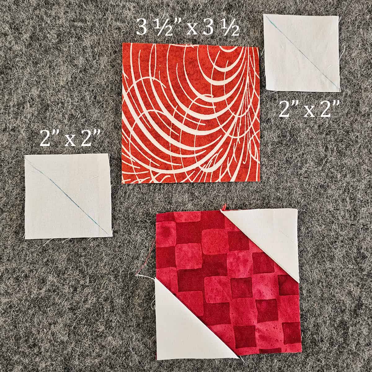 Each quilt block is a 3½” unfinished size. For the red blocks use 2 different reds and cut: